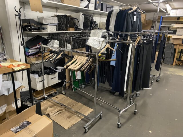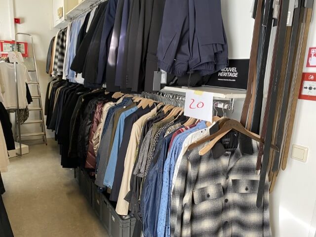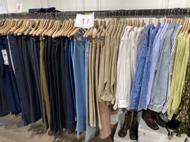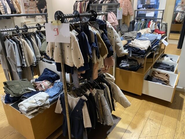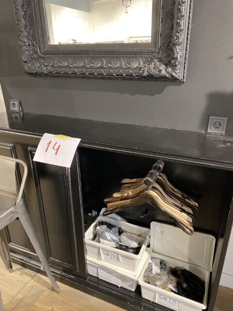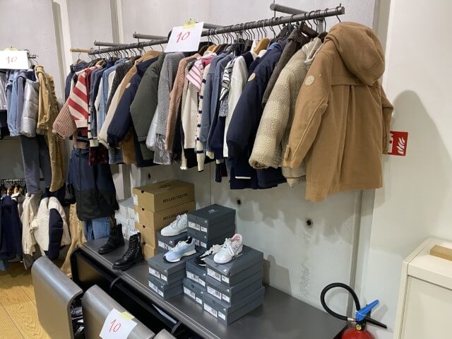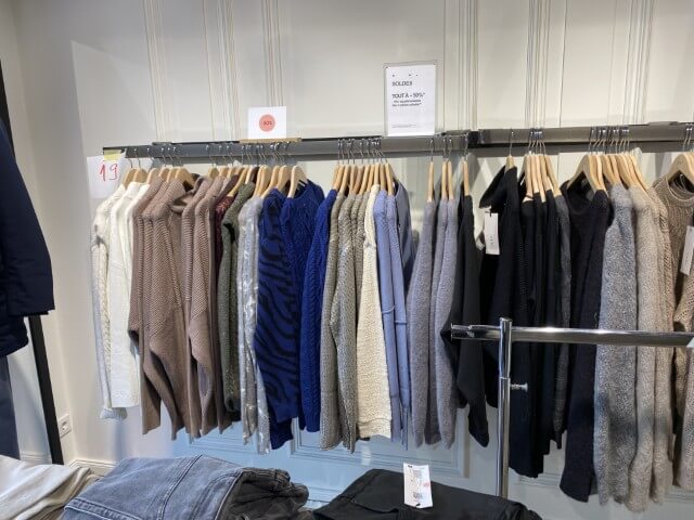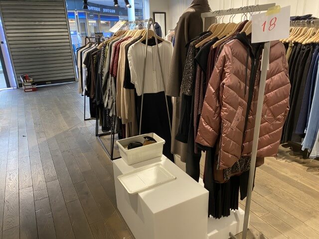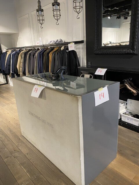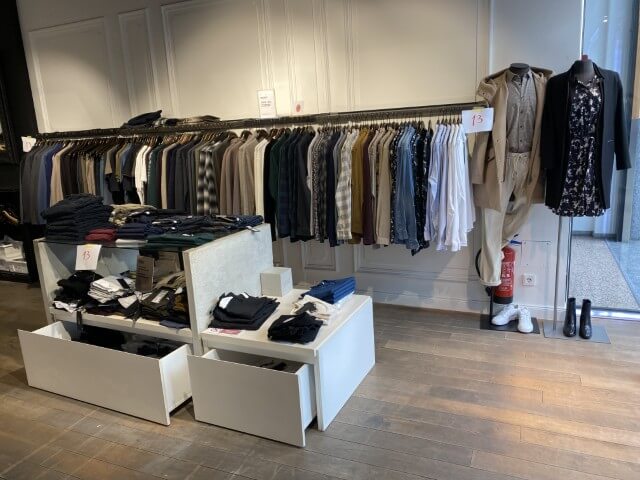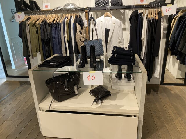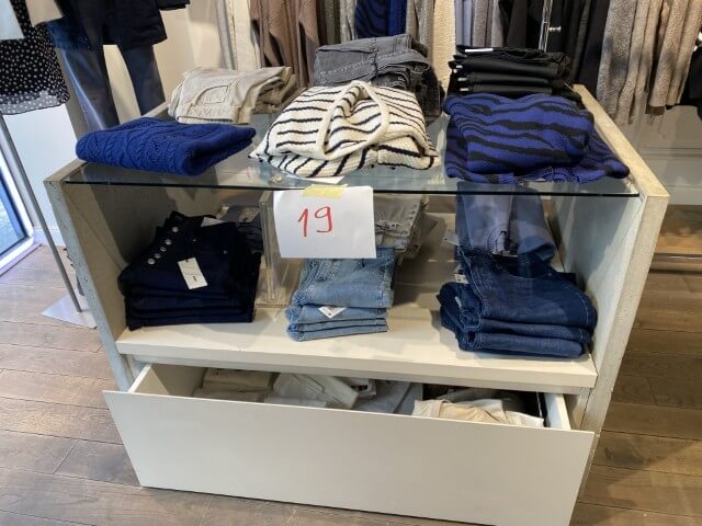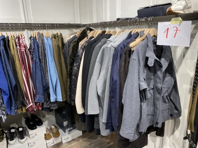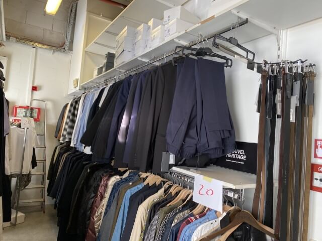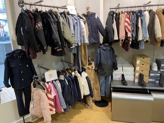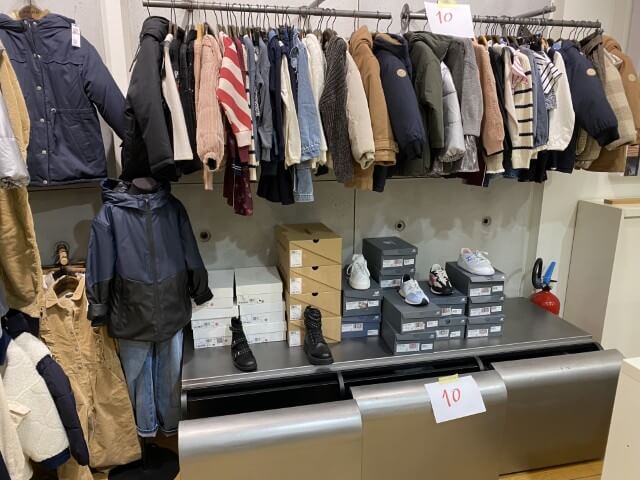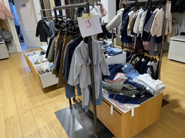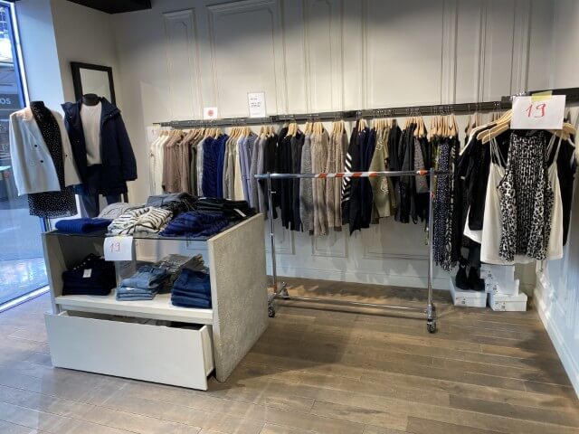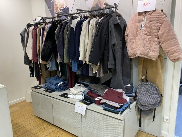 Magasin complet de prêt-à-porter comprenant importants lots de vêtements pour enfants, hommes et femmes (vestes, manteaux, chemises, pantalons, robes, T-shirts, polos, sweats, etc.), nombreuses paires de chaussures enfants, femmes et hommes, sacs à main et ceintures, mannequins, nombreux présentoirs et mobilier de présentation (présentoirs avec tiroirs, présentoirs mobiles pour vêtements, étagères et présentoirs muraux).