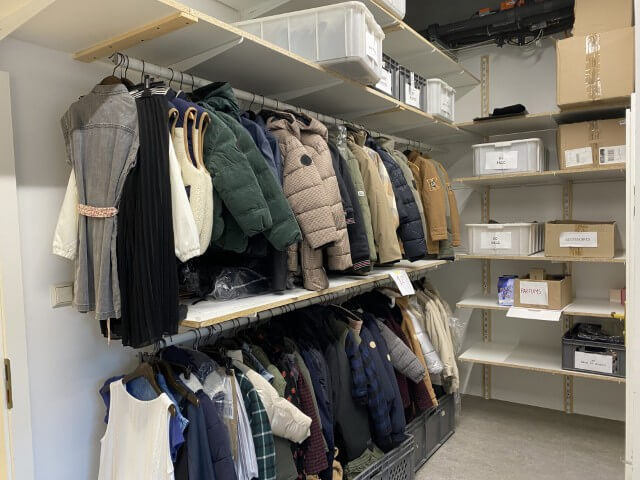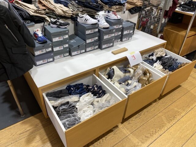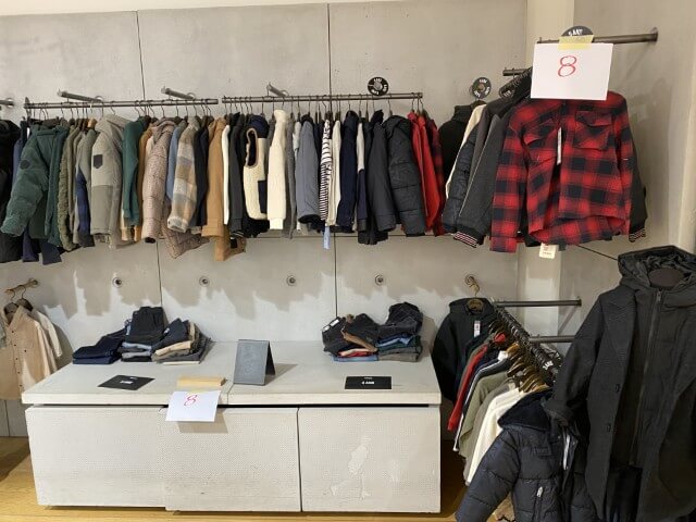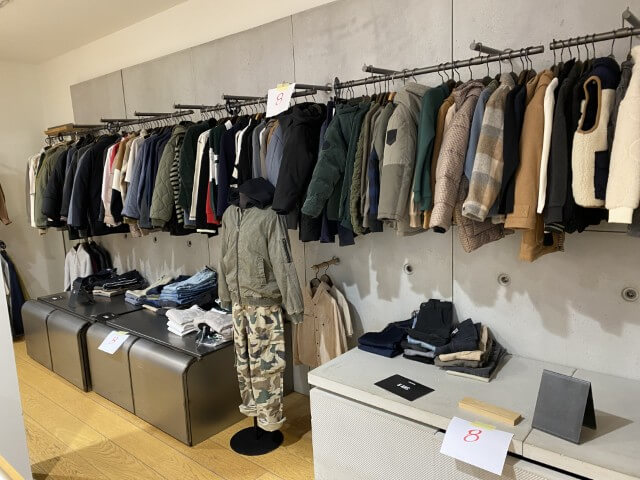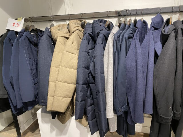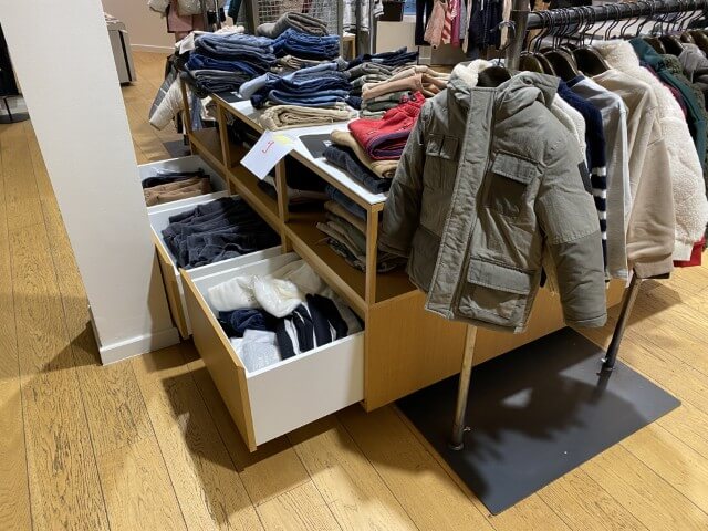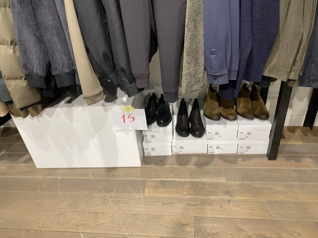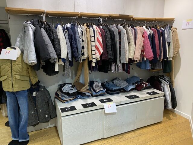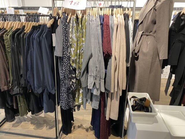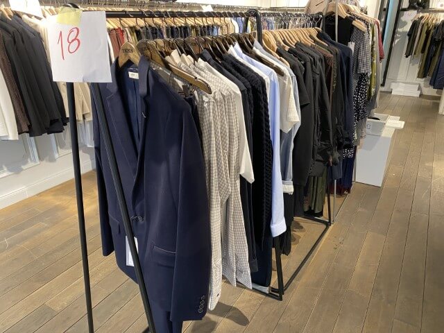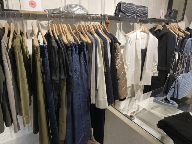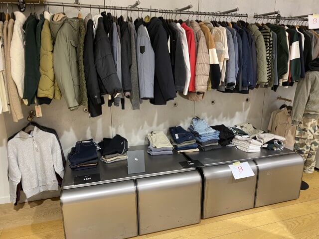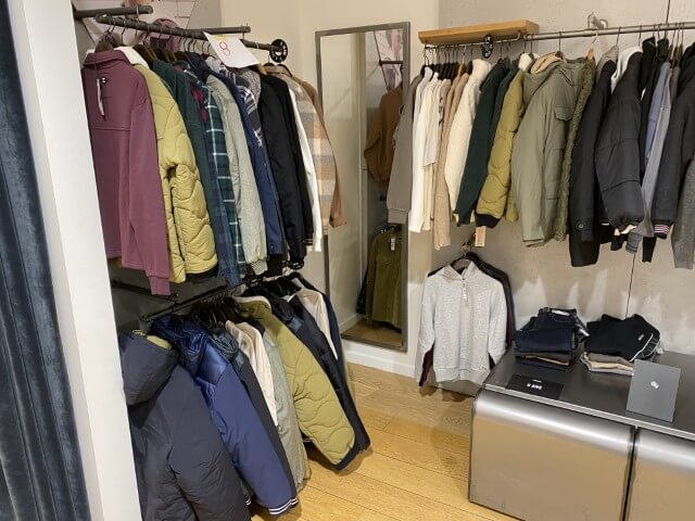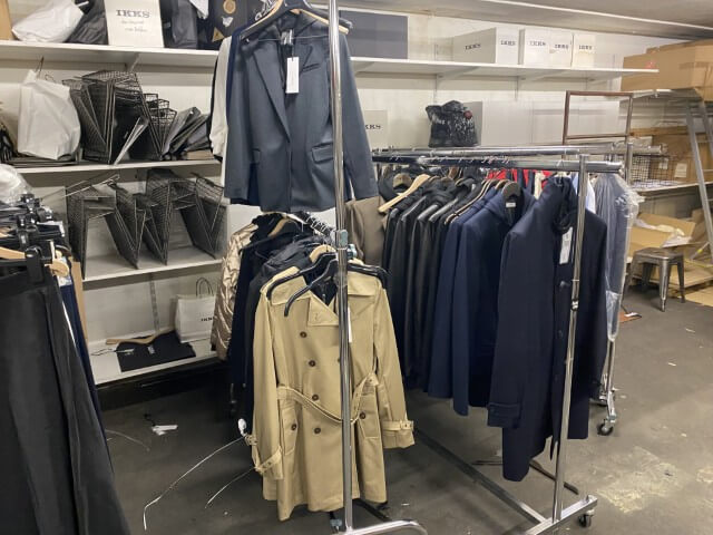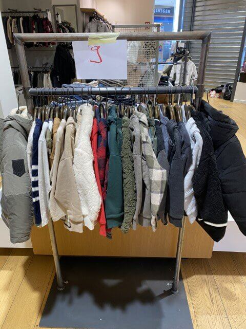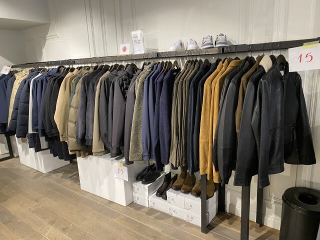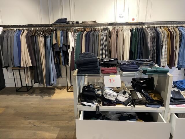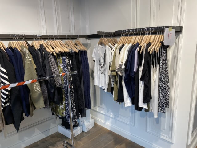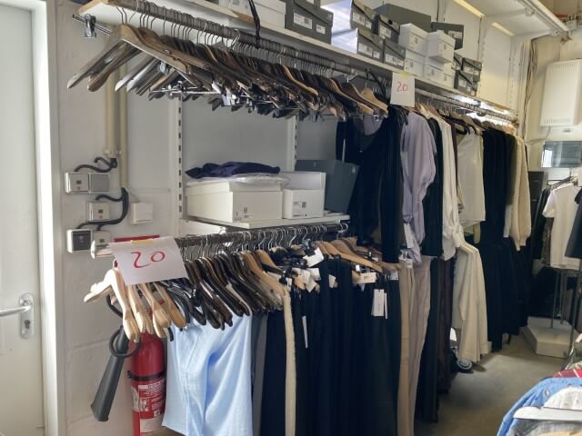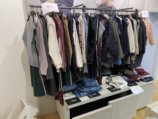 Magasin complet de prêt-à-porter comprenant importants lots de vêtements pour enfants, hommes et femmes (vestes, manteaux, chemises, pantalons, robes, T-shirts, polos, sweats, etc.), nombreuses paires de chaussures enfants, femmes et hommes, sacs à main et ceintures, mannequins, nombreux présentoirs et mobilier de présentation (présentoirs avec tiroirs, présentoirs mobiles pour vêtements, étagères et présentoirs muraux).