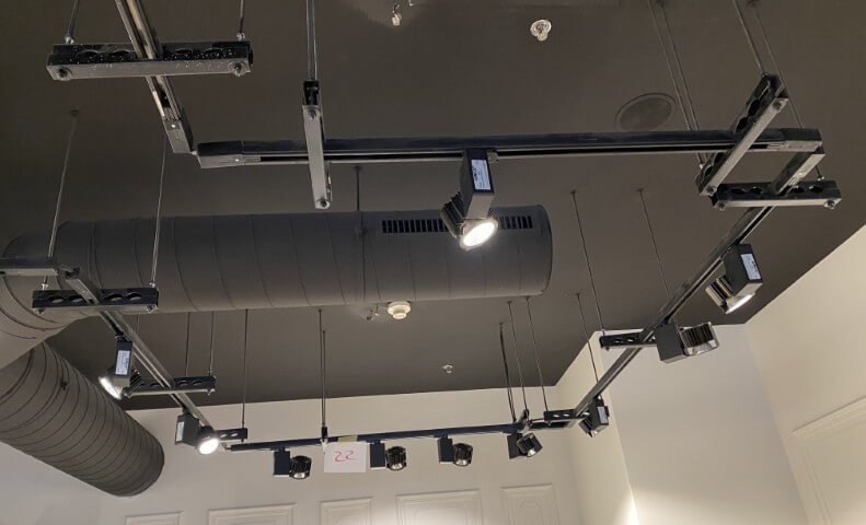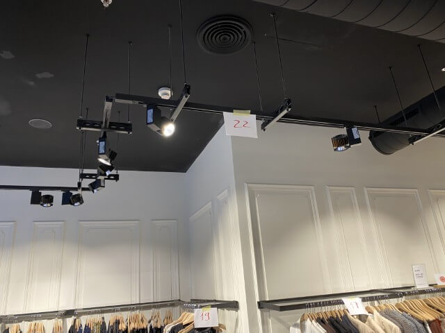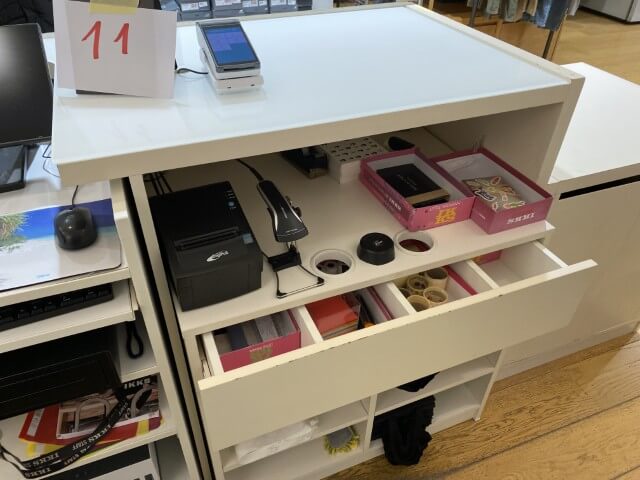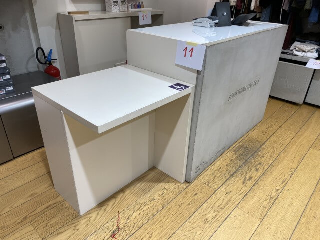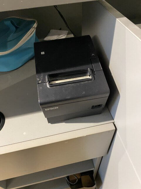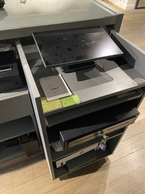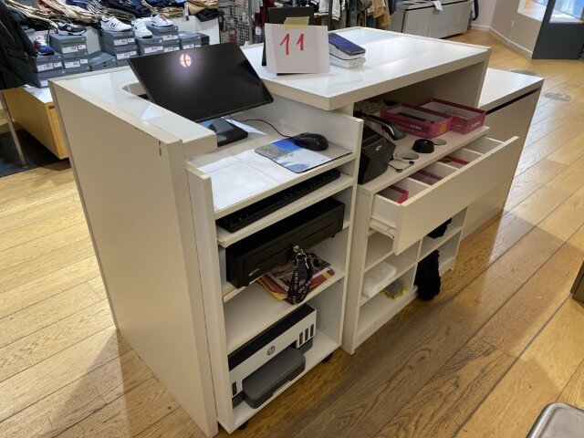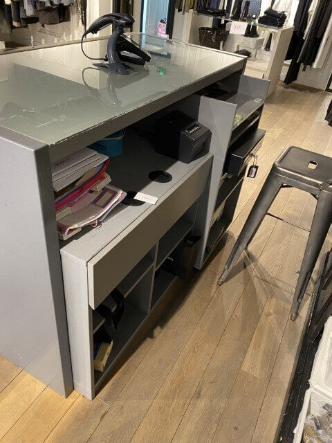 Sont également compris plusieurs comptoirs de caisse avec systèmes POS complets (imprimantes de tickets, scanners code-barres, moniteurs tactiles, claviers avec souris et terminaux de paiement), imprimantes, GSM Samsung, mobilier de rangement, tabourets, lampadaires suspendus, ainsi que divers matériels de magasin et de bureau.
