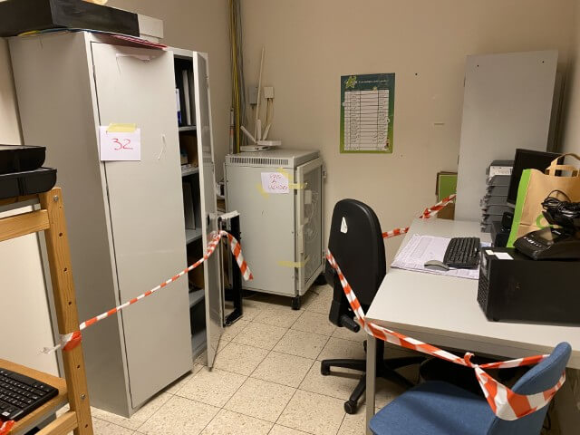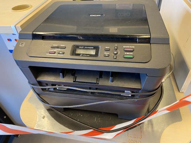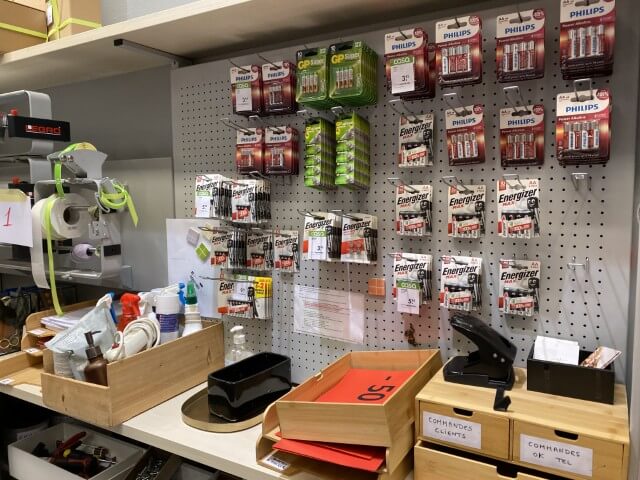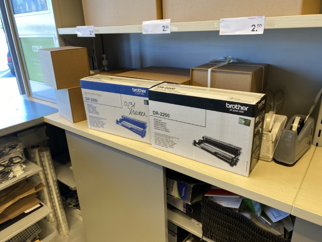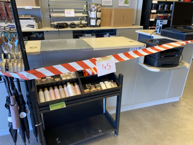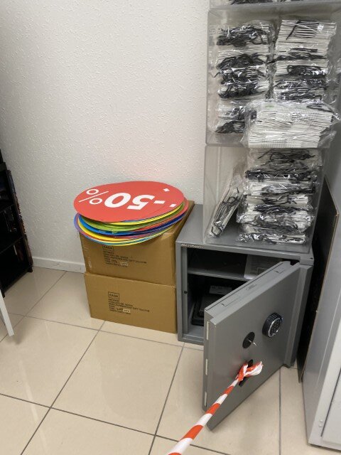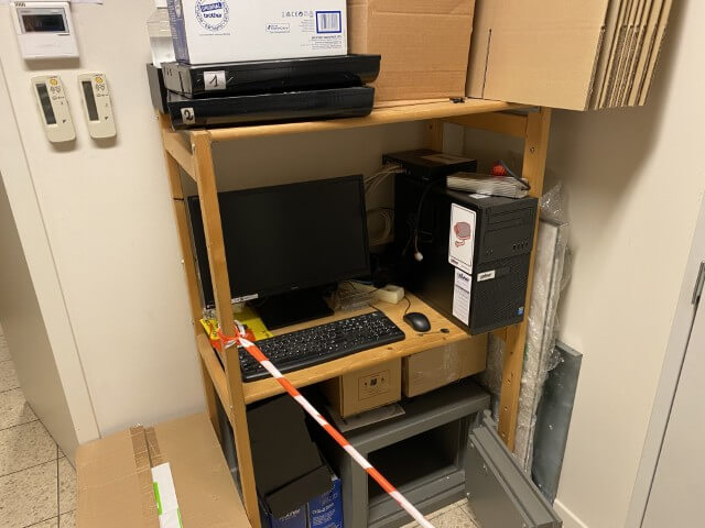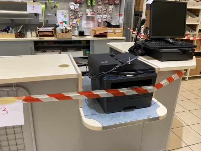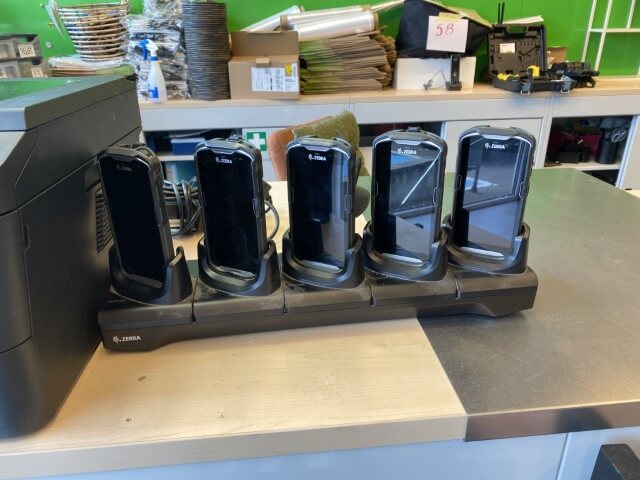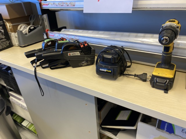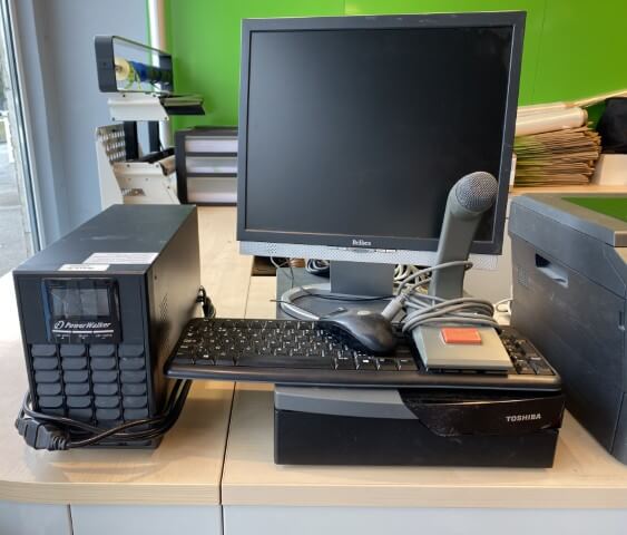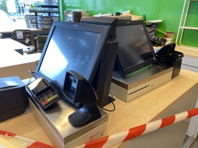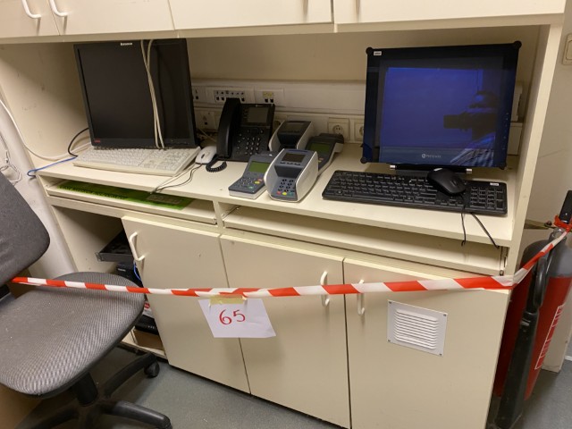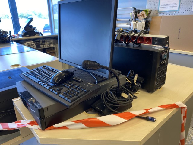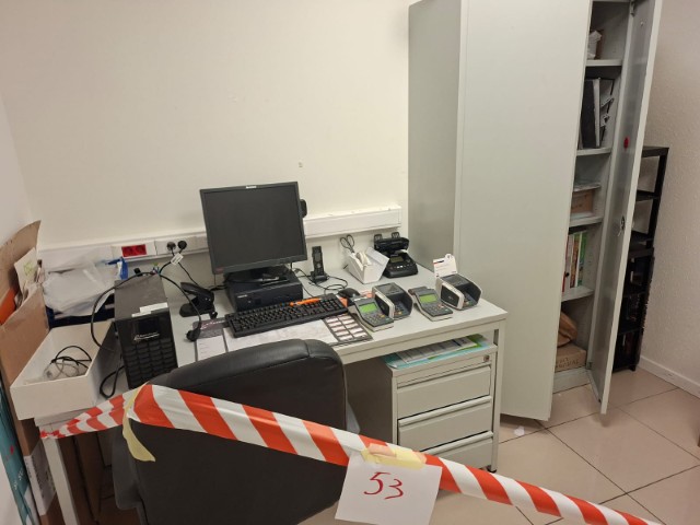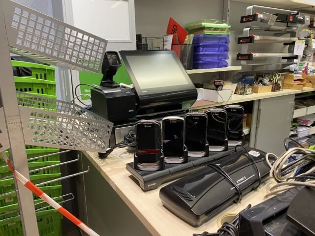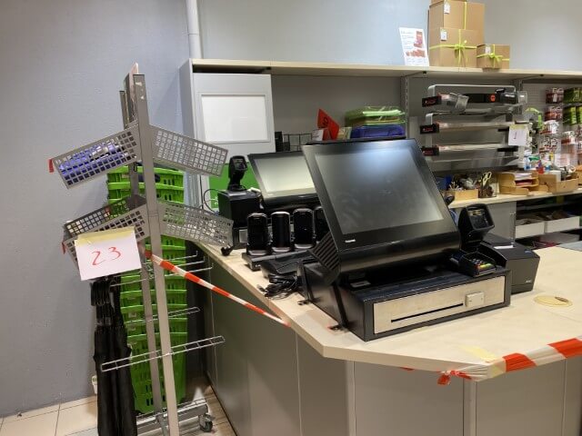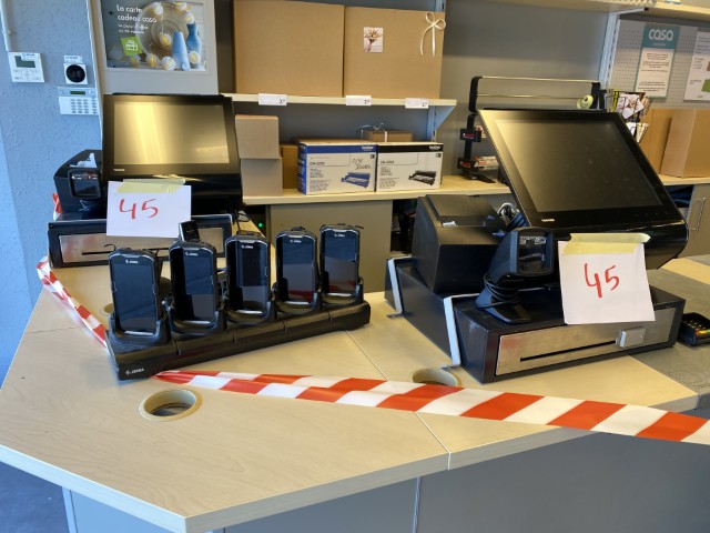 Matériel informatique et électronique : ordinateurs complets, caisses enregistreuses avec scanners, terminaux de paiement TOSHIBA, imprimantes BROTHER, compteurs de billets, scanners de code-barres ZEBRA avec stations de charge, plastifieuse, régulateurs de tension Power Walker, téléphones.